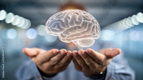 Mental Health in the Workplace A person holds a glowing brain hologram, symbolizing knowledge and innovation in a modern setting.