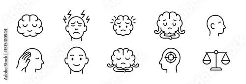 Mental health linear icon set - calm, stress, emotional well-being symbols