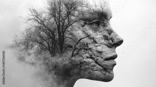 Mental health problem Concept. Portrait of woman with double exposure have manic and depress emotion in inner world. Abstract black and white surreal mind emotion art.