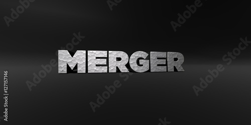 MERGER - hammered metal finish text on black studio - 3D rendered royalty free stock photo. This image can be used for an online website banner ad or a print postcard.