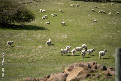 Merino sheep, grazing and eating grass in New zealand and Australia in summer