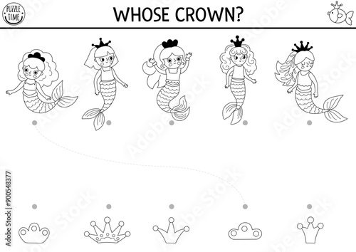 Mermaid black and white shadow matching activity with sea princess, crown. Ocean kingdom line puzzle with girl. Find correct silhouette printable worksheet, game. Marine coloring page for kids
