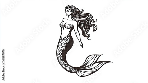 Mermaid drawing. Fantasy illustration, beautiful mermaid character, ocean art, swimming siren, vintage tattoo design, underwater female figure