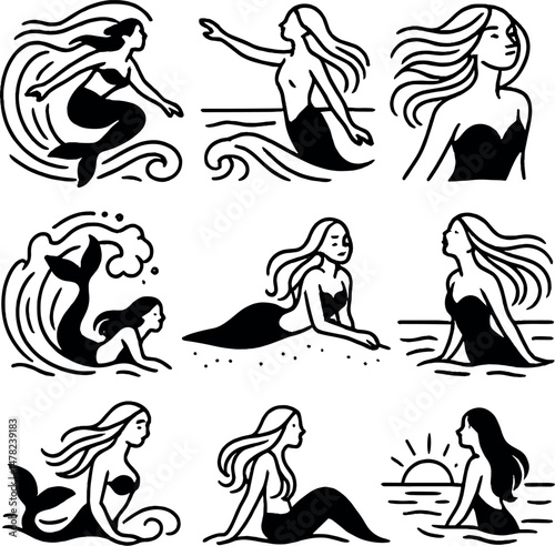 Mermaid silhouette icons set – simple, elegant and ocean-themed designs