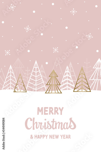 Merry Christmas and Happy New Year - greeting card with wishes and trees. Vector illustration
