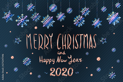 Merry Christmas and Happy New Year 2020 year blue snowflakes glittering lettering design. Vector illustration EPS10