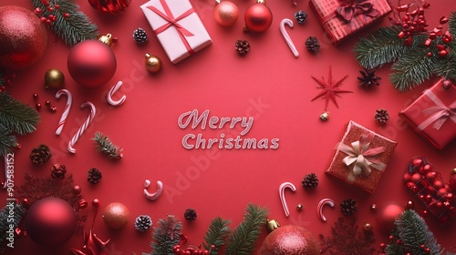 Merry Christmas and happy New Year background - Merry Christmas Text with Festive Decorations on Red Background_4