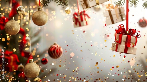 Merry Christmas and Happy New Year background. Realistic 3d Xmas design, falling gift boxes and gold confetti hanging on ribbon glass balls decoration light garland Christmas tree. Vector illustration