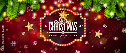 Merry Christmas and Happy New Year Banner with Light Bulb Billboard, Fir Branch and Ornaments on Red Background. Vector Holiday Season Design for Greeting Card, Party Flyer, Celebration Poster and