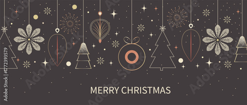 Merry Christmas and Happy New Year card or banner with holiday gold line icons. Luxury dark background with Christmas tree snowflake toys, baubles, stars, bell, ball geometric minimal. Vector design.