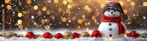 Merry christmas and happy new year greeting card with copy-space.Happy snowman standing in christmas landscape.Snow background.Winter fairytale