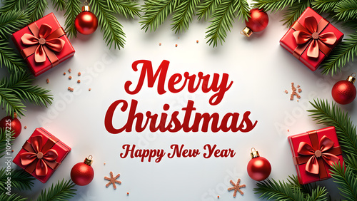 Merry Christmas and Happy New Year greeting card with gifts and ornaments. Concept of winter holidays, celebration, and festive season.