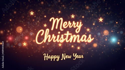 Merry Christmas and Happy New Year greeting card with golden text and bokeh lights. Concept of celebration, winter holidays, and festive season.