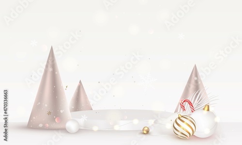 Merry Christmas and Happy New Year. Podium studio with Christmas balls, fir branches, decoration.Holidays template