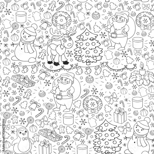 Merry Christmas and happy new year. Santa Claus, deer, snowman, penguin. Vector pattern.