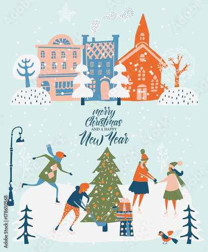 Merry Christmas and happy New year vector greeting card with winter games and people. Celebration template with playing cute people in vintage style.