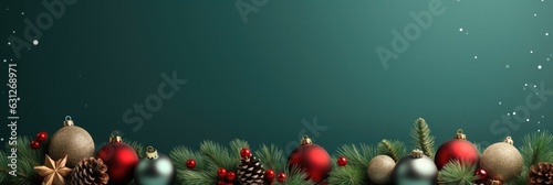 Merry Christmas banner with blank space for text, green background, giftboxes, fir tree branches, red and green ornaments