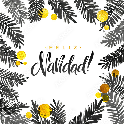 Merry Christmas Black and Gold Card. Golden Shiny Glitter and Watercolor Tree Branches. Calligraphy Greeting Poster Tamplate. Isolated White Background. Glowing Illustration