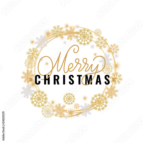 Merry Christmas festive greetings, calligraphic print with winter season wishes. Wishes on Xmas, lettering for postcards, vector wreath tag with snowflakes