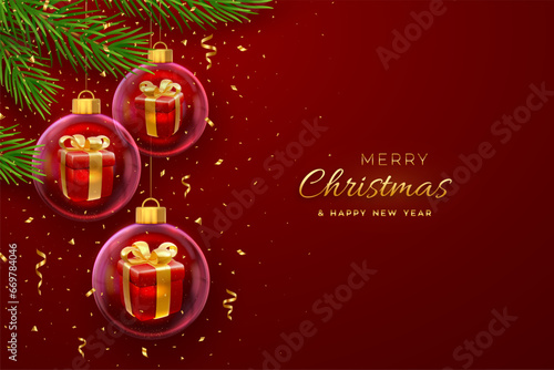 Merry christmas greeting card or banner. Hanging transparent glass balls baubles with gift boxes inside, pine branches on red background, golden confetti. New Year Xmas design. Vector illustration.