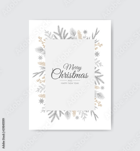 Merry Christmas greeting card with new years tree. Hand drawn design vector illustration.