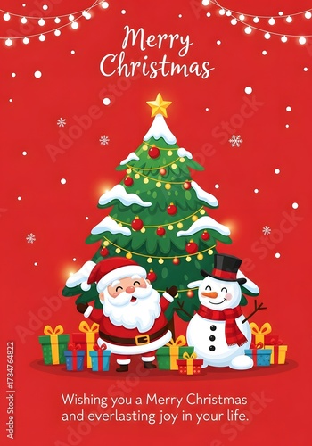 Merry Christmas Greeting Card with Santa, Snowman, and Decorated Tree on Red Background