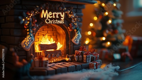 Merry Christmas kirigami paper craft letters set before a cozy fireplace scene, intricately cut with glowing logs, stockings, and garlands,