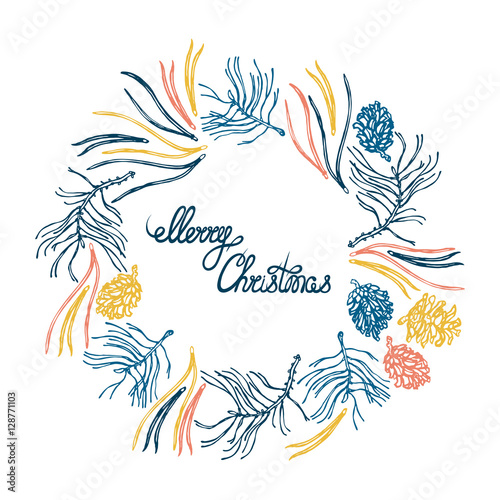 Merry Christmas! Round wreath with branches, needles, pine cones. Hand drawn. Vector illustration.