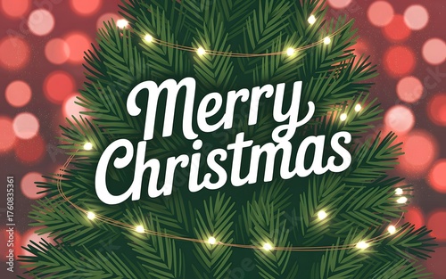 Merry christmas text on a decorated evergreen tree with bokeh lights