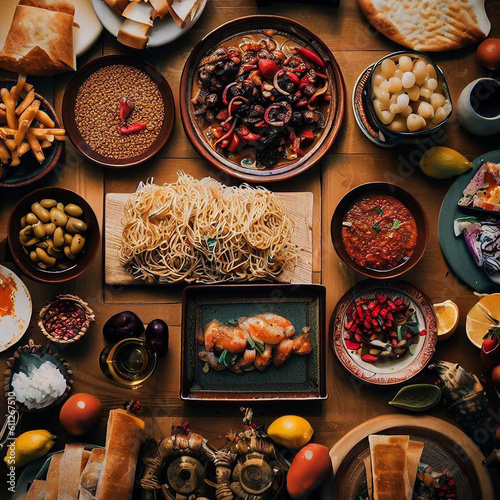 Mesa abastecida tipo banquete con diferentes platos de comida