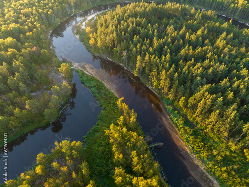 Meschersky national park, river Pra meandering among pine and birch forest, september morning, aerial photo