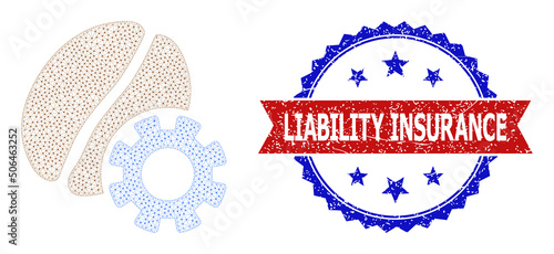 Mesh coffee options carcass illustration, and bicolor grunge Liability Insurance seal stamp. Polygonal carcass image is created from coffee options pictogram.