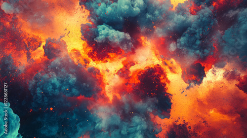 mesmerizing abstract art of teal and fiery explosion with smoke background and intense color contrast for dramatic images or digital design projects