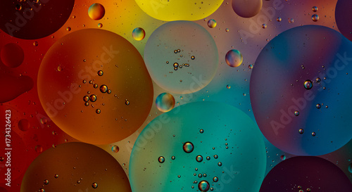 Mesmerizing abstract background of vibrant oil droplets suspended in water, forming intricate spherical patterns and a captivating, textured surface