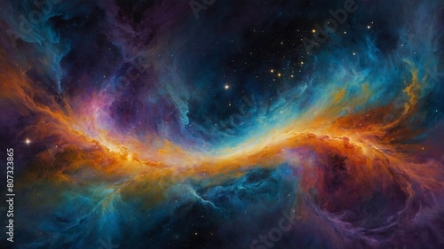 Mesmerizing cosmic dance unfolds as vibrant nebulae, swirling with mix of radiant colors, intertwine in celestial ballet, illuminated by distant gleam of stars. Vivid hues of blue, purple,.