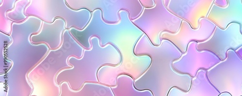 Mesmerizing Holographic Geometric Puzzle Pattern with Interlocking Iridescent Shapes on White Background