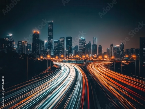 mesmerizing long-exposure capture of a busy urban highway at dusk. streaking lights from vehicles paint light trails against a glowing city skyline.