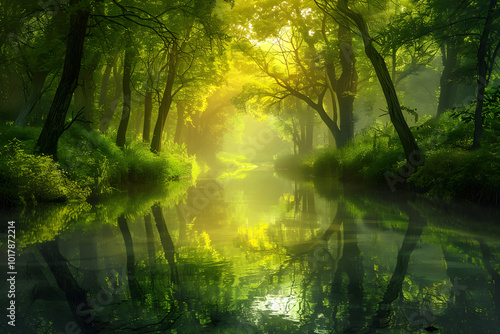 Mesmerizing Serenity - A Lush Forest Landscape with a Calm, Reflective River Bathed in Warm Sunlight