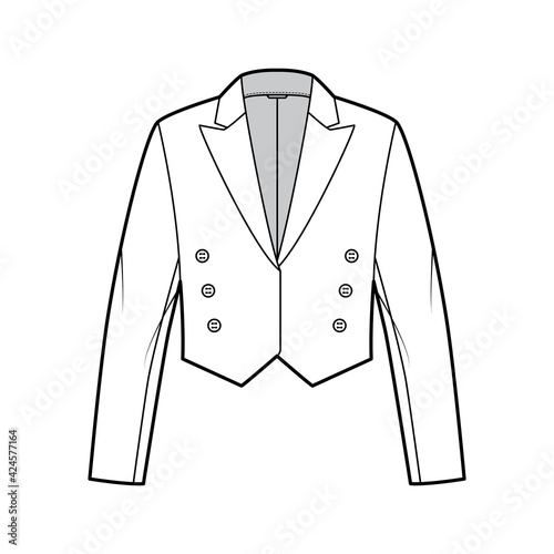 Mess eton jacket spencer technical fashion illustration with non-fastening double breast cut, long sleeves, crop waist length. Flat coat template front, white color style. Women, men top CAD mockup