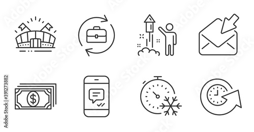 Message, Payment and Fireworks line icons set. Freezing timer, Update time and Sports arena signs. Human resources, Open mail symbols. Phone messenger, Finance, Party pyrotechnic. Vector