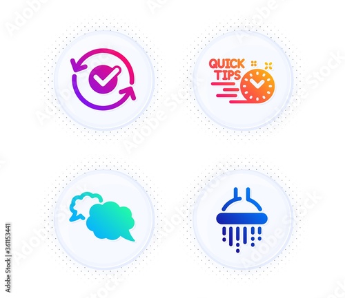 Messenger, Approved and Quick tips icons simple set. Button with halftone dots. Shower sign. Speech bubble, Refresh symbol, Helpful tricks. Bathroom. Technology set. Vector