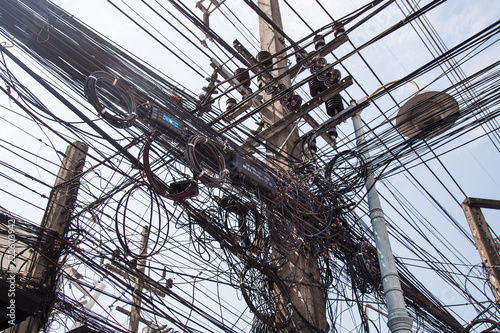 Messy entangled electricity, telecommunication wires, cables in under-developed city