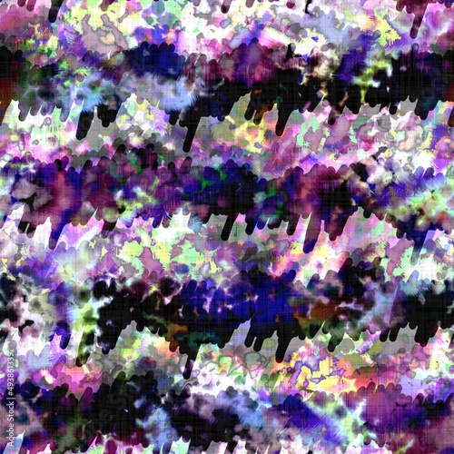 Messy summer tie dye batik beach wear pattern. Seamless colourful stain space dyed effect fashion. Washed out soft furnishing background.