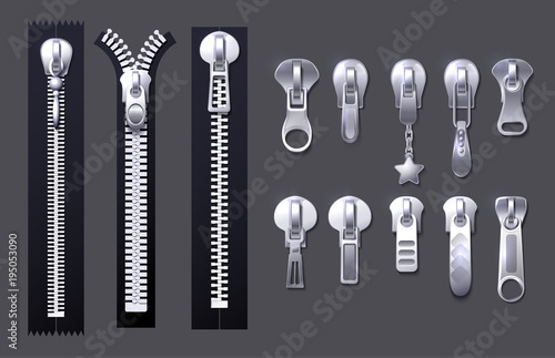 Metal and plastic fasteners, zippers. Garment components and handbag accessories vector set