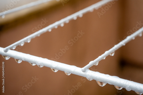 Metal clothesline with water droplets hanging from it after rain. It illustrates meteorology. Real photo