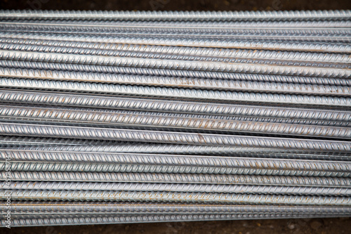 Metal corrugated reinforcement stacked in a gray color. Construction design, production backgrounds.