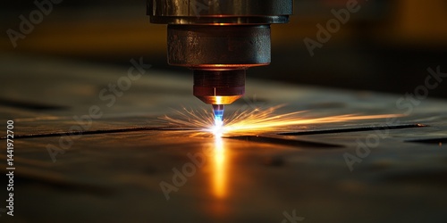 Metal cutting process with a laser, creating a bright blue beam and shower of sparks.