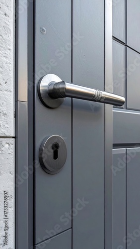 Metal Door with Round Handle and Keyhole Detail in Close Up Grey Door with Horizontal Panels and Textured Wall Background