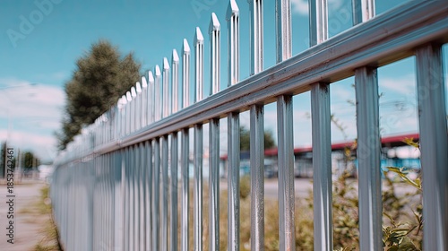 Metal fence with pointed tips against a blurred blue sky backdrop