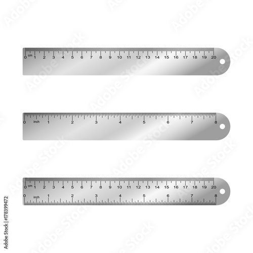 Metal measuring rulers in centimeters, inches, millimeter - aparted and combined. Vector illustration.